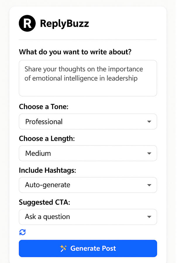 🌟Save time replying to industry updates, peer posts, or viral threads🌟Show up daily with confidence and consistency🌟Post like a pro—even when you're short on time or ideas🌟92% of beta testers said ReplyBuzz made replies feel more thoughtful🌟 Users saved up to 5 hours/week on social media engagement🌟 70% saw an increase in profile views after using Post Crafter